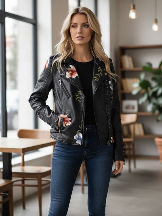 Maribel | Chaqueta de cuero para mujer con flores bordadas, chic y elegante