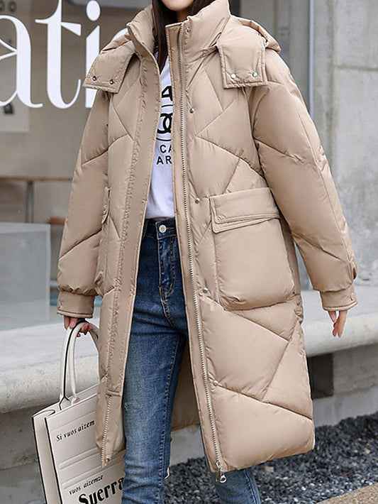 Precioso abrigo de invierno con capucha de piel sintética para mujer