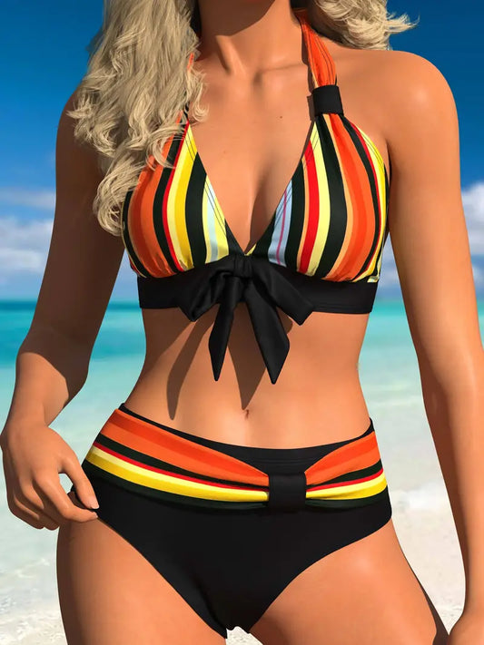 Bikini halter con estampado de rayas de colores y cordón para atar