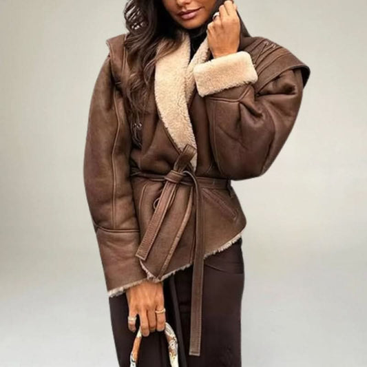 Chaqueta de piel de alta calidad con cinturón para mujer
