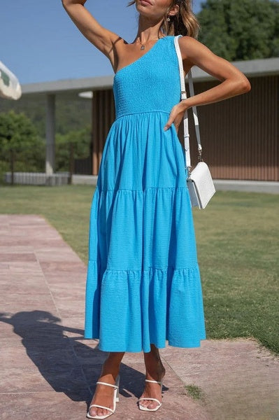 Alivia - Vestido midi asimétrico con hombros al descubierto y bolsillos