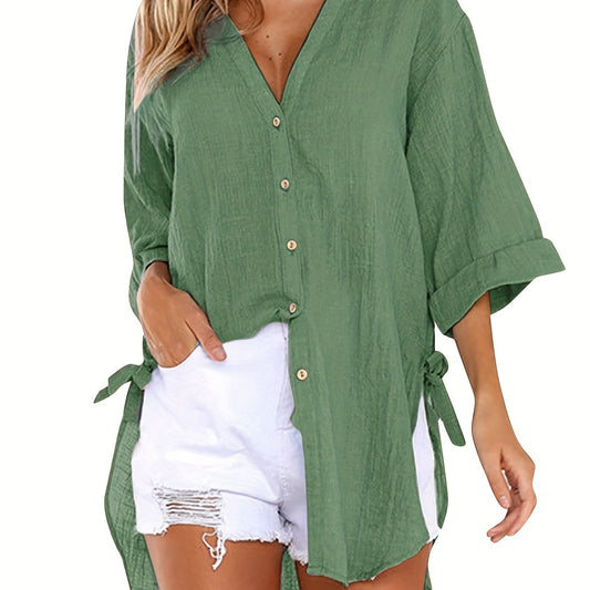 Camila Blusa Casual Azul Cuello en V Media Manga Sólida con Botones