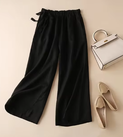 Pantalones de corte recto con lazo caqui y cintura alta elástica