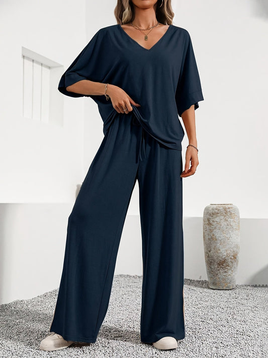 Elise - Conjunto de salon con cuello en V y pantalones anchos para mujer
