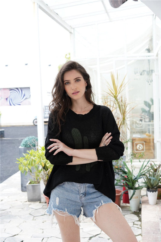 Jersey de cuello redondo de punto por cable y manga larga en color liso para mujer
