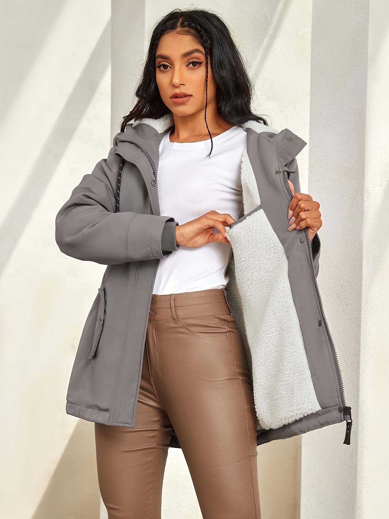 Chaqueta casual de invierno gris con capucha forrada de piel sintética para mujer | Ideal para otoño/invierno