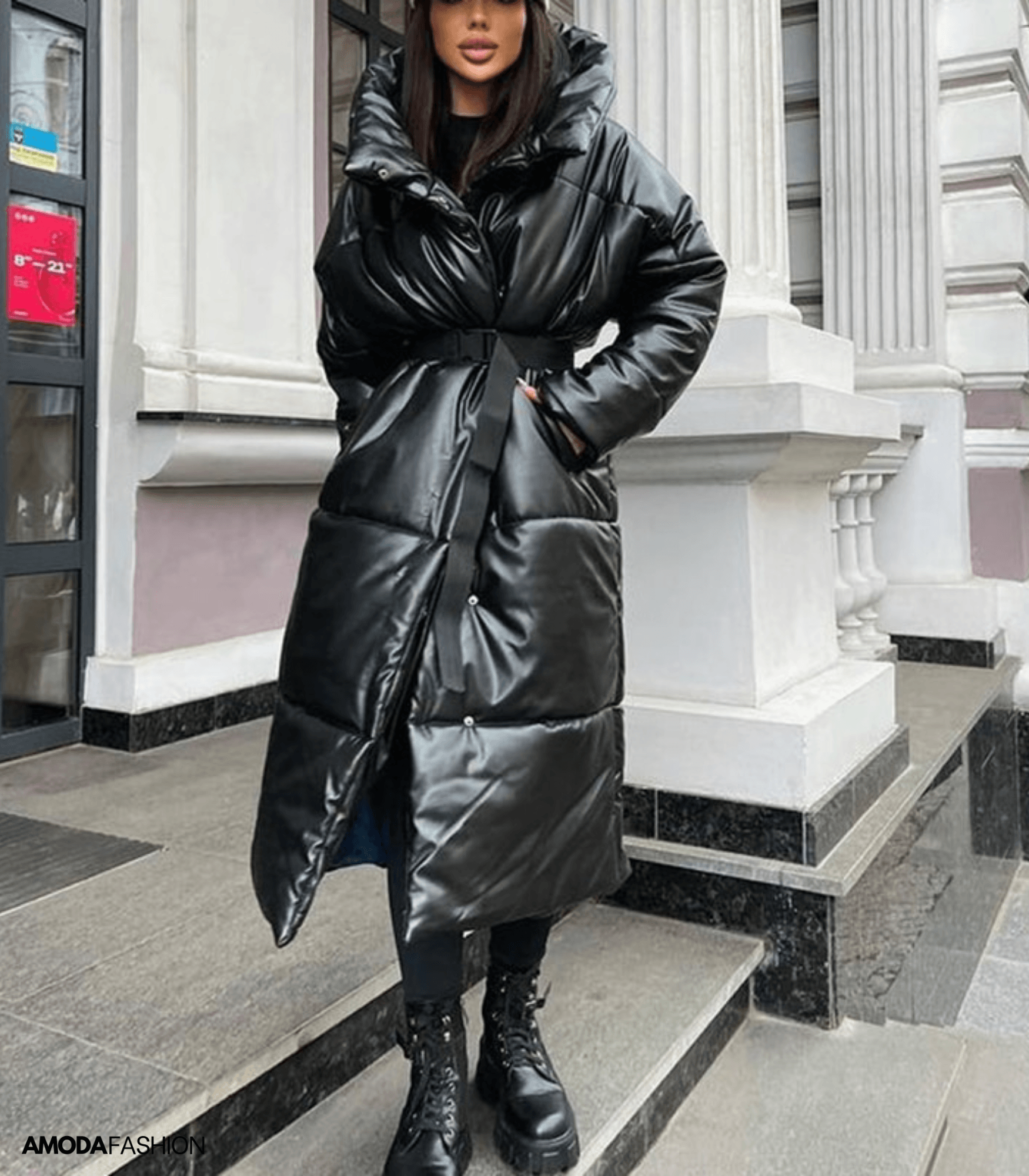 Chaqueta larga de piel para mujer con cinturón