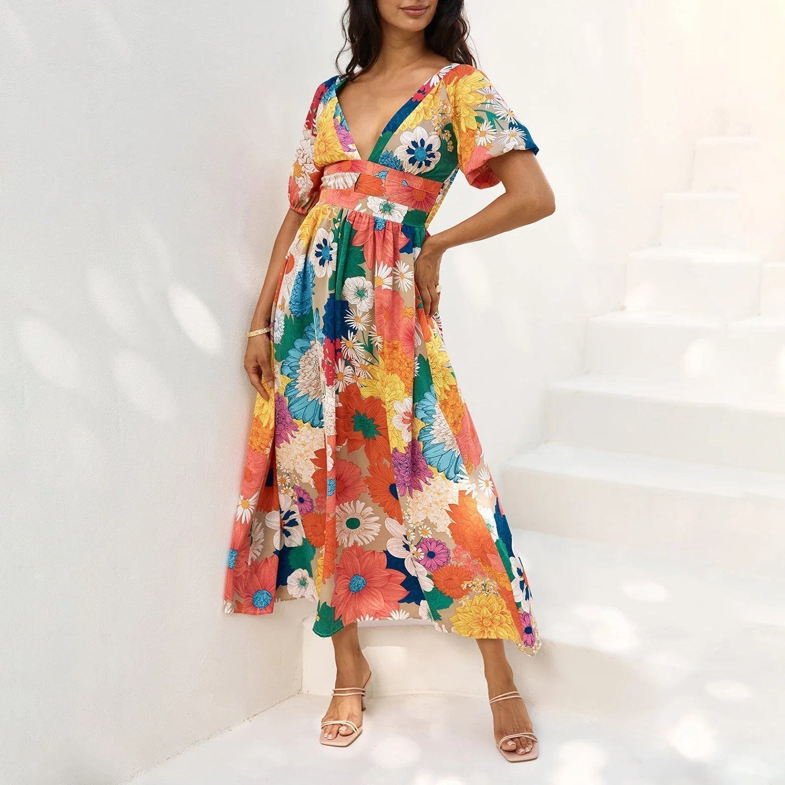 Vestido largo con estampado floral y mangas cortas abullonadas